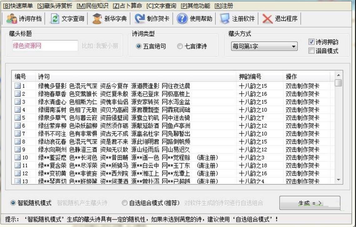 3、智能随机模式:结合用户输入的藏头标题,智能生成几绿色资源网百首押韵的藏头诗供用户挑选,用户要做的仅是挑选其中一首这么简单;