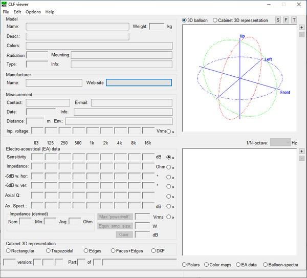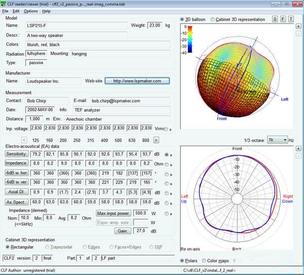 该软件将打开CLF文件并以数字和图形方式显示数据。查看器允许将方向数据显示为彩色 3D 气球、彩色 3D 球体、水平和垂直极线或气球光谱。其他频率相关数据,例如阻抗、Q 等,可以用图形绘制。许多数据项可能有进一步的解释,并且可能包含专用的 pdf 或文本文件。