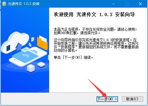 1、在本站下载光速传文软件包,解压缩后双击“gscwsetup1.0.3.exe”程序进入欢迎安装界面,点击下一步继续