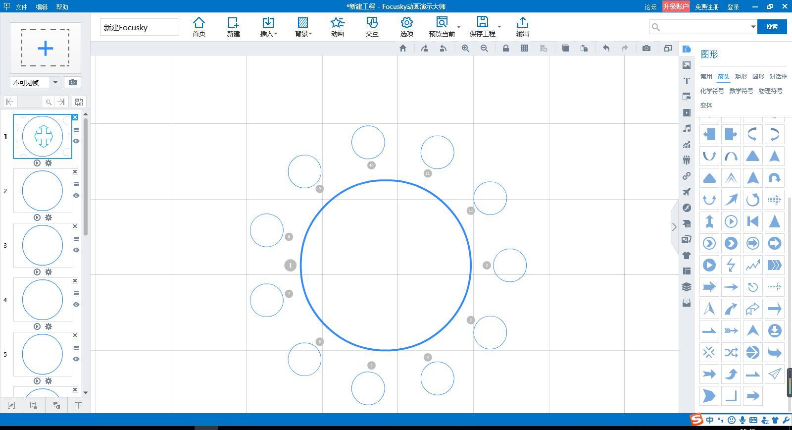 1、打开focusky软件新建一个工程,使用focusky软件创建好的幻灯片以后点击右上角的输出选项