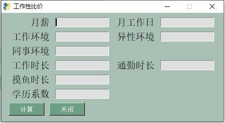 工作价比最新版是一款可以帮助用户计算工作价软件。工作价比版的体积不大,由Python语言开发,在win7、win8、win10系统中均可使用。工作价比最新版,界面简洁,作简便,用户使用时按要求填写数值测算即可,软件占用内存小,易于上手。