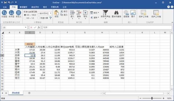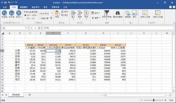 启动EvaGear,将以上数据输入(或复制粘贴)到EvaGear的”原始数据”工作表中。完成后的窗口截图如下图所示: