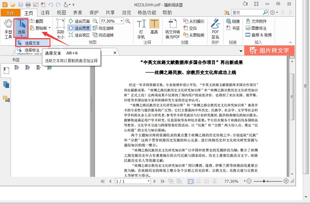 3、打开要编辑的PDF文件后,这时会看到菜单栏会自动切换到“主页”。我们找到如下图所指的“选择”选项,左击打开它有两个选项:选择文本、选择标注。要复制PDF文件中的部分文字,这里选择“选择文本”单击一下就可以了。