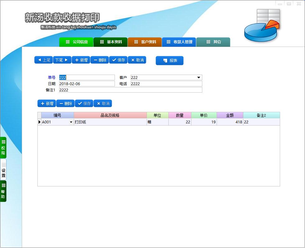 新汤收款收据打印版是一款高效实用的收款收据打印助手,新汤收款收据打印版结合最新需要而打造,支持公司,基本资料,客户资料和收款人管理等功能。新汤收款收据打印中文版具有美观的界面设计,功能特色一目了然。