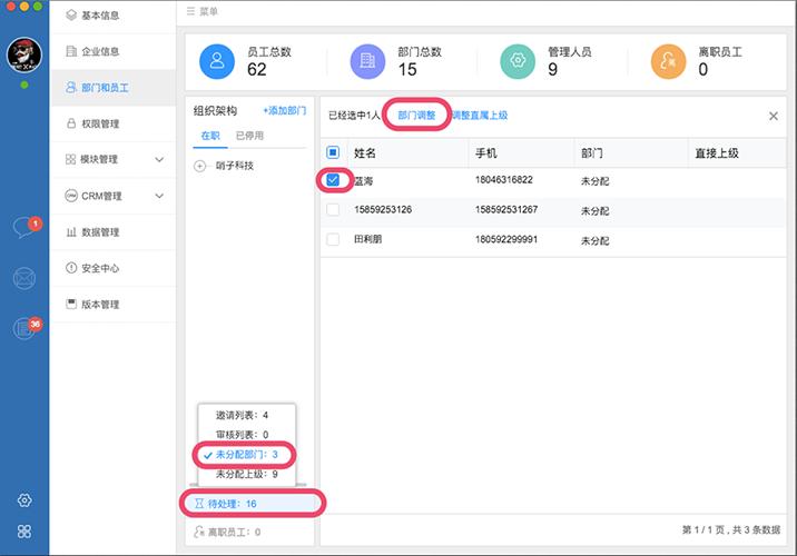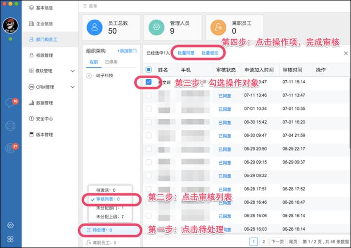 对审核通过的人员进行部门分配(不分配部门将会导致此员工无法被指派任务、审批等作)