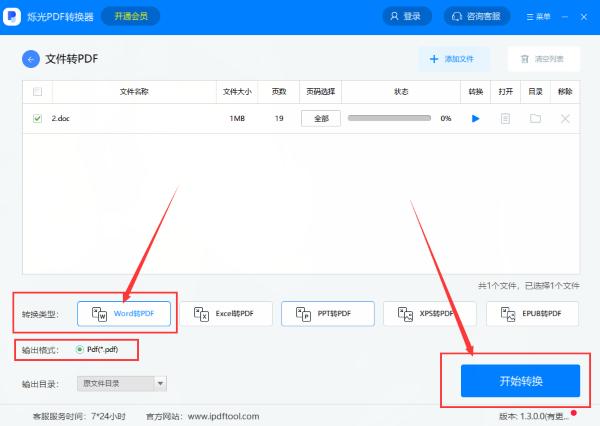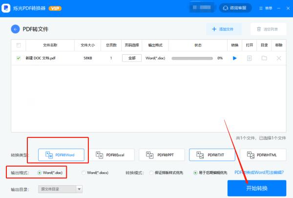 3、添加PDF文件后,选择转换类型为【PDF转Word】,设置好输出格式和输出目录,最后点击开始转换按钮。