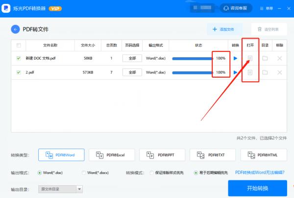 4、等待转换进度到达100%之后,PDF转Word就完成了,点击打开即可查看文件。