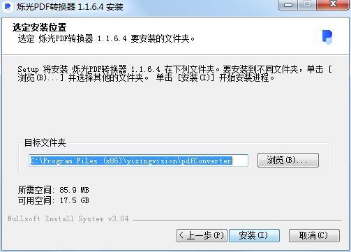3、选择安装位置,默认的是C:Pgram Files (x86)yixingvisionpdfConverter,可以点浏览修改,点击安装