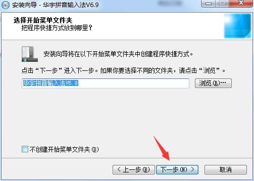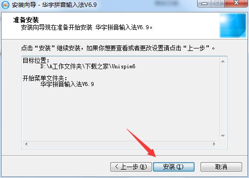 3、设置软件的安装位置,小编把华宇拼音输入法V6. g安装到D: A工作文件夹下载资源库Uni spimB文件夹中。建议安装在D盘,若要继续,单击“下一步”。如果你要选择不同的文件夹,请单击“浏览”进行设置。