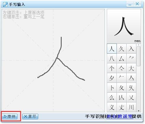2、如果只是之前的一笔没有写到位或者写错,需要修改的话,可以通过点击手写输入法左下角的“撤销”按钮,或者直接在软件界面内单击鼠标右键,即可擦去上一笔。