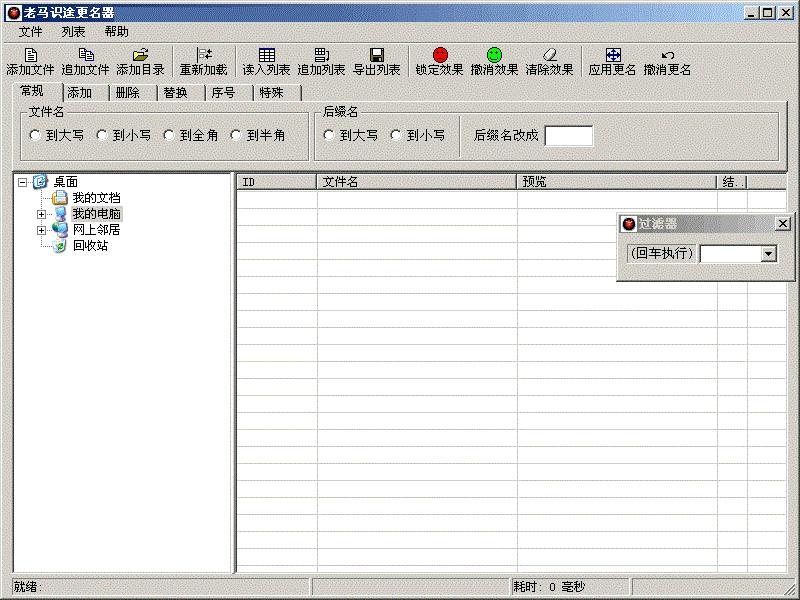 《老马识途更名器》是一款纯绿色的文件批量更名器。虽然互联网同类软件多如牛毛,但是真正的精品却是凤毛麟角,更多的是良莠不齐,鱼龙混杂, 要么早已经停止更新要么设计混乱,毫无美观之感,要么功能深不见底,让用户琢磨不透…为了扫除此种不成熟的现状,作者特别推出了这款设计新颖,界面简洁,功能实用,作简单的批量更名工具。