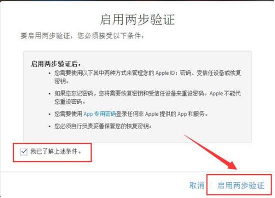 第八步,勾选“我已了解上述条件”,点击启用两步验证,那么两步验证就开启成功。
