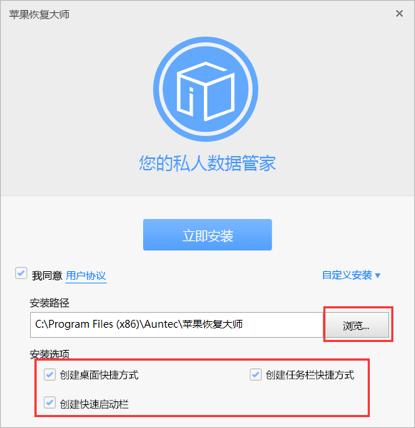 2.在“自定义安装”中点击【浏览】可选择并更改您想要存储的安装路径,根据需要可勾选相应的安装选项。