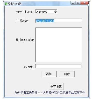 大漠驼铃远程开机工具是一款小巧实用的开机助手,设置好开机时间,广播IP(如果网段是192.168.0.X,则设置为192.168.0.255),把需要启动开机的电脑mac地址添加进来。这样只需要局域网中有一台电脑开着,运行这个小工具,其他电脑就可以按时开机了。