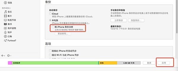 2、将【备份】功能中的【给iPhone备份加密】取消勾选(不选中),最后单击右下角【应用】按钮保存设置。