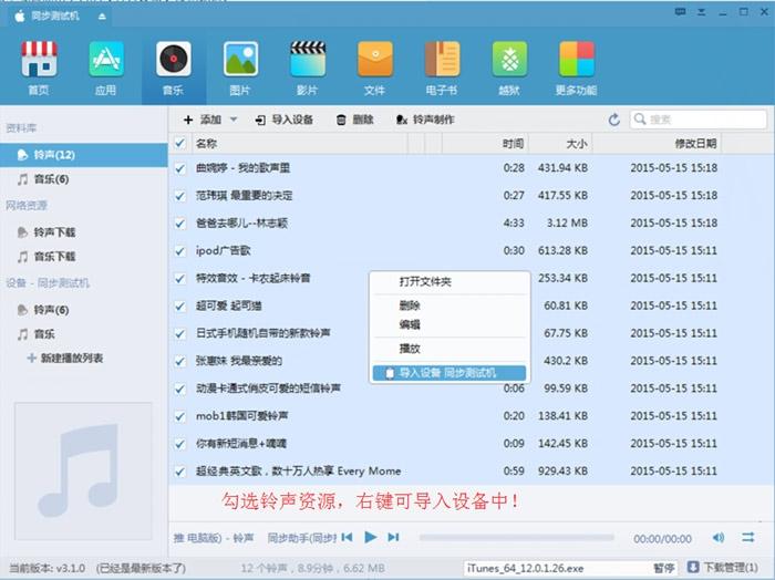 连接设备到同步助手,切换到音乐界面。选中设备底下到区,点击【导入】可添加电脑本地的资源(支持mp3、m4r、wav等格式)。