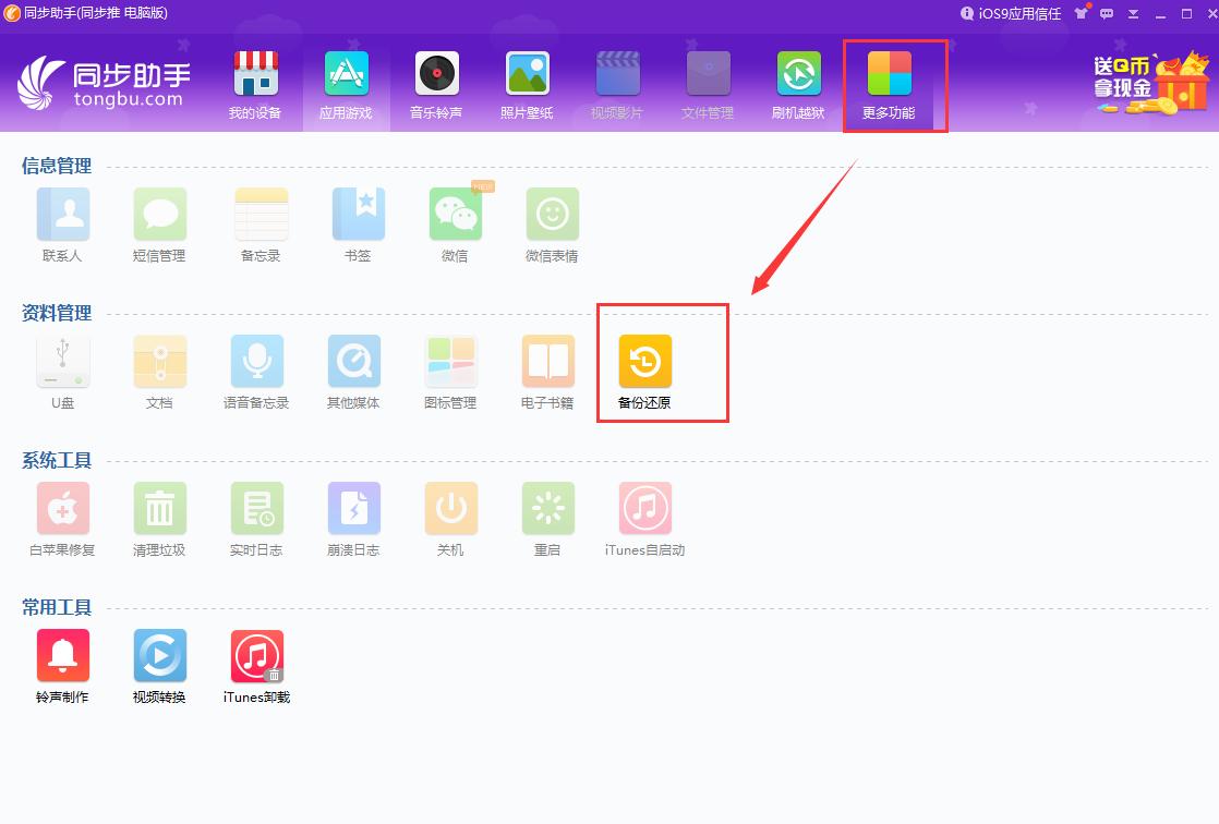 打开同步助手点击【更多功能】,选择【备份还原】,点击【创建备份】。