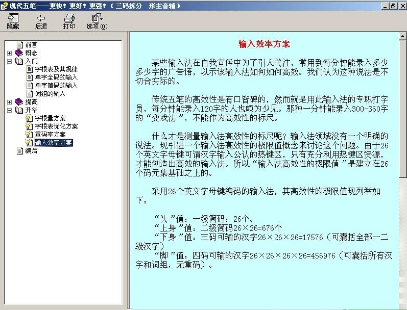 高效的输入法不易用,易用的输入法不高效。这一对输入法史上由来已久的矛盾,在现代五笔输入法中得到了合理解决。现代五笔的简码量、重码率、字根规则三项设计指标,在以字母键编码的输入法群体中,已接近极限值。