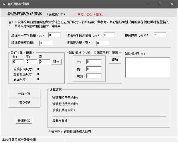 鱼缸计算器版是一款适用于制作鱼缸的计算软件。鱼缸计算器最新版,采用四面包底的做法设计尺寸,支持用于对输入的各种数值进行快速的打印,可以快速的帮助用户计算机出所需要制作鱼缸的总费用。鱼缸计算器版具体尺寸可参考浴缸主体计算结果,其它拉筋和过滤用玻璃在辅助板材栏里输入。