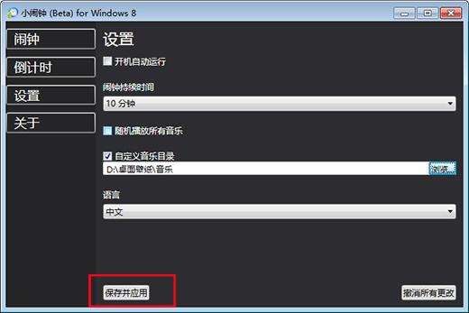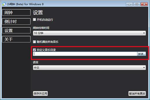 1、打开小闹钟软件,点击“设置”框选“自定义音乐目录”