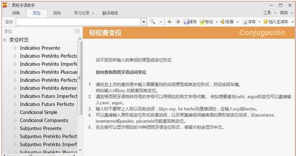 动词变位查询功能, 西班牙语助手电脑版收入所有西班牙语动词的19种变位形式,支持反查,每个动词、每种变位形式都有详细说明