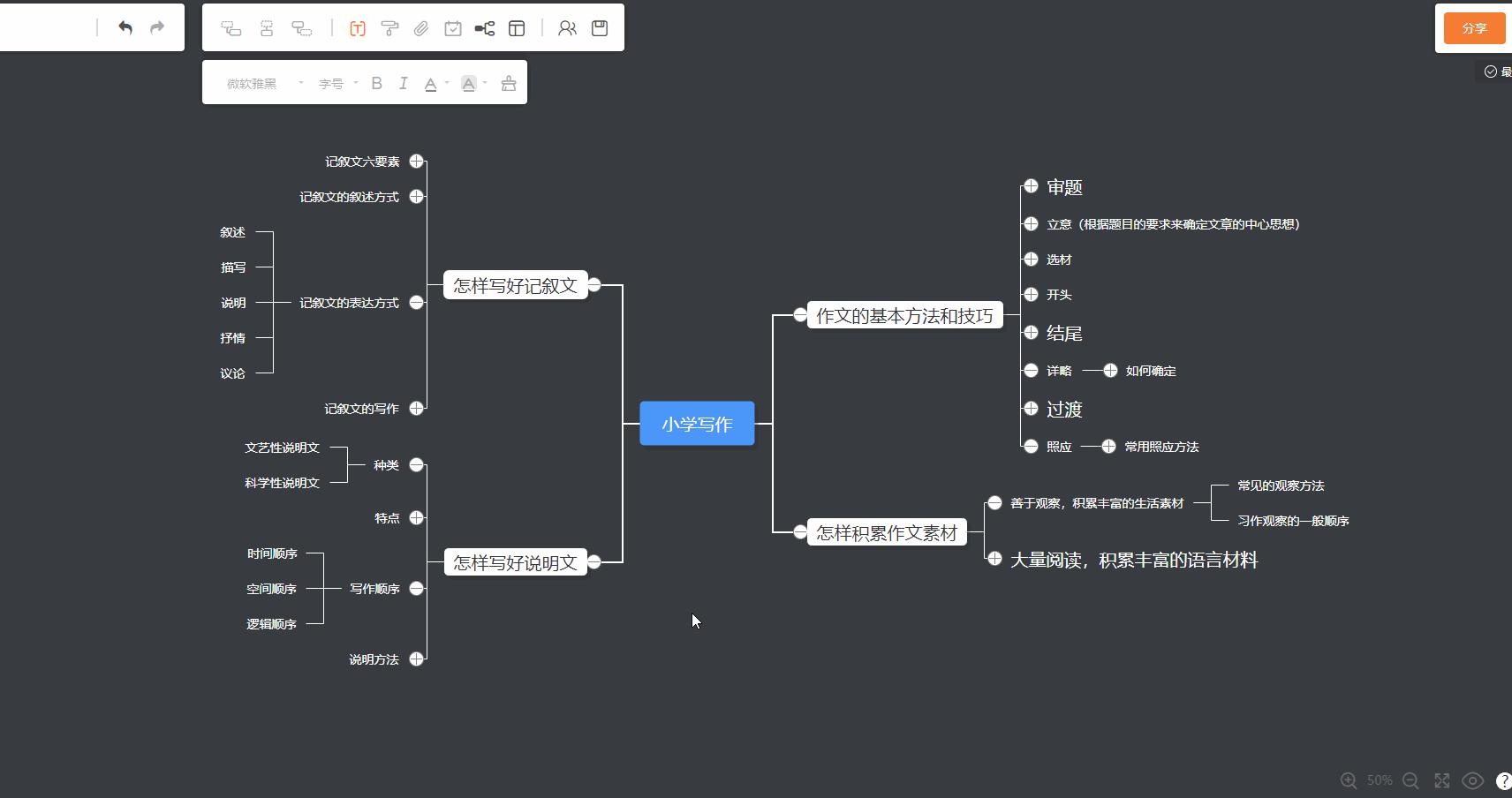 搭配丰富的快捷键,可以快速制作出想要的思维导图,使用”Enter”键快速添加同级节点,”Tab”键添加下级节点,”Shift + Tab”添加上级节点,如果对节点不满意,还可以使用”Delete”键删除节点。