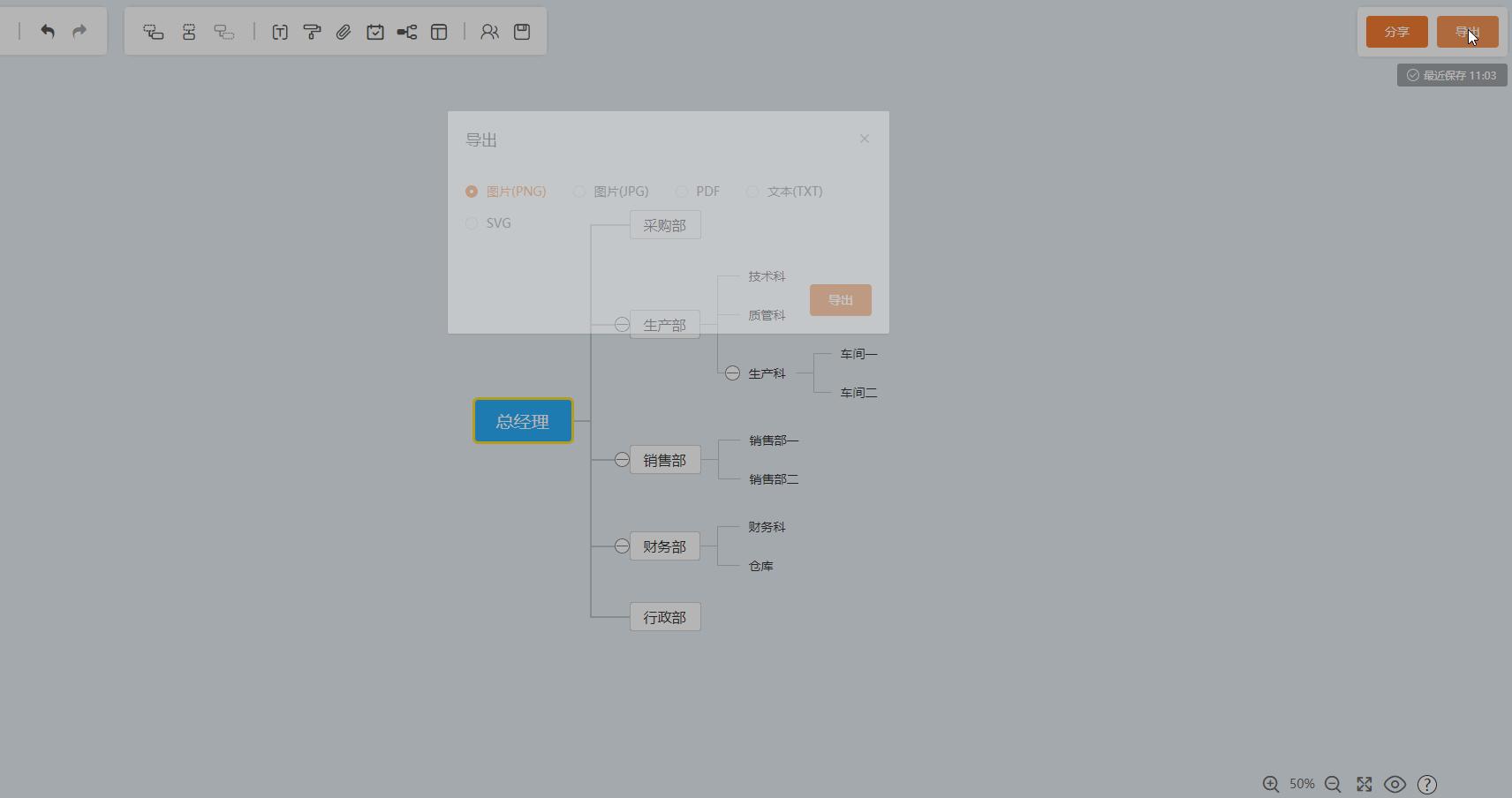 点击【导出】,可弹出导出框,导出方式可选择图片、PDF文件、TXT文本以及SVG可编辑矢量图。