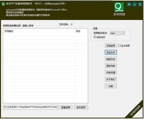 奈末PPT批量转助手是一款专门用于PowerPoint文件批量转的软件,支持ppt,pptx转。电脑须安装有Micsoft Office。本软件具有运行稳定,兼容好,批量作,简单易用。软件为绿色版,解压即可用,无需安装。提供多种输出格式mp4,wmv,avi。pptx批量转mp4,pptx批量转wmv,pptx批量转avi,powerpoint批量转mp4。