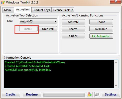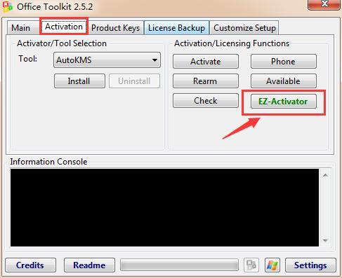 点击上图红框中的office图标,进入主界面后选择“Activation”菜单选项,先点左侧的“install”,显示AutoKMS安装成功。再点击右侧下面的“EZ-Activator”按钮。