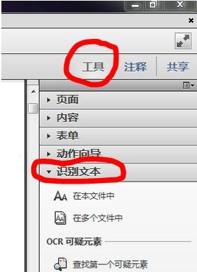 3、在Adobe Acbat X P软件工具栏右侧,依次找到工具——识别文本,如下图所示: