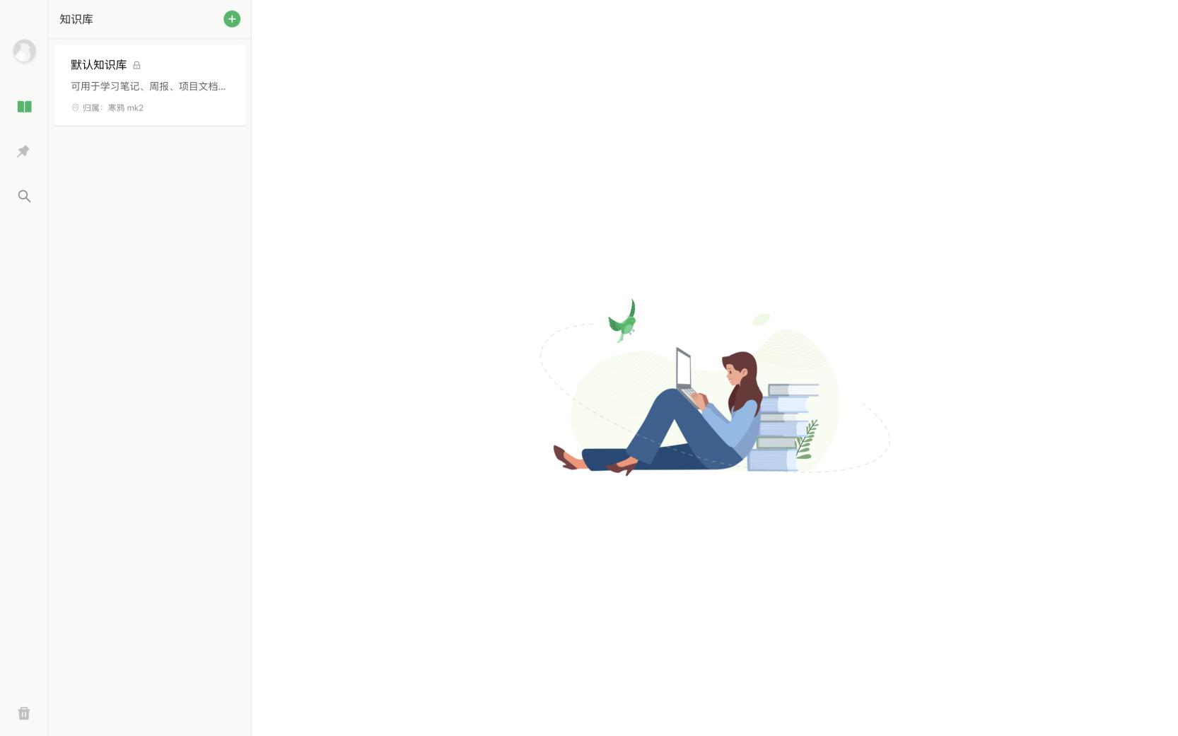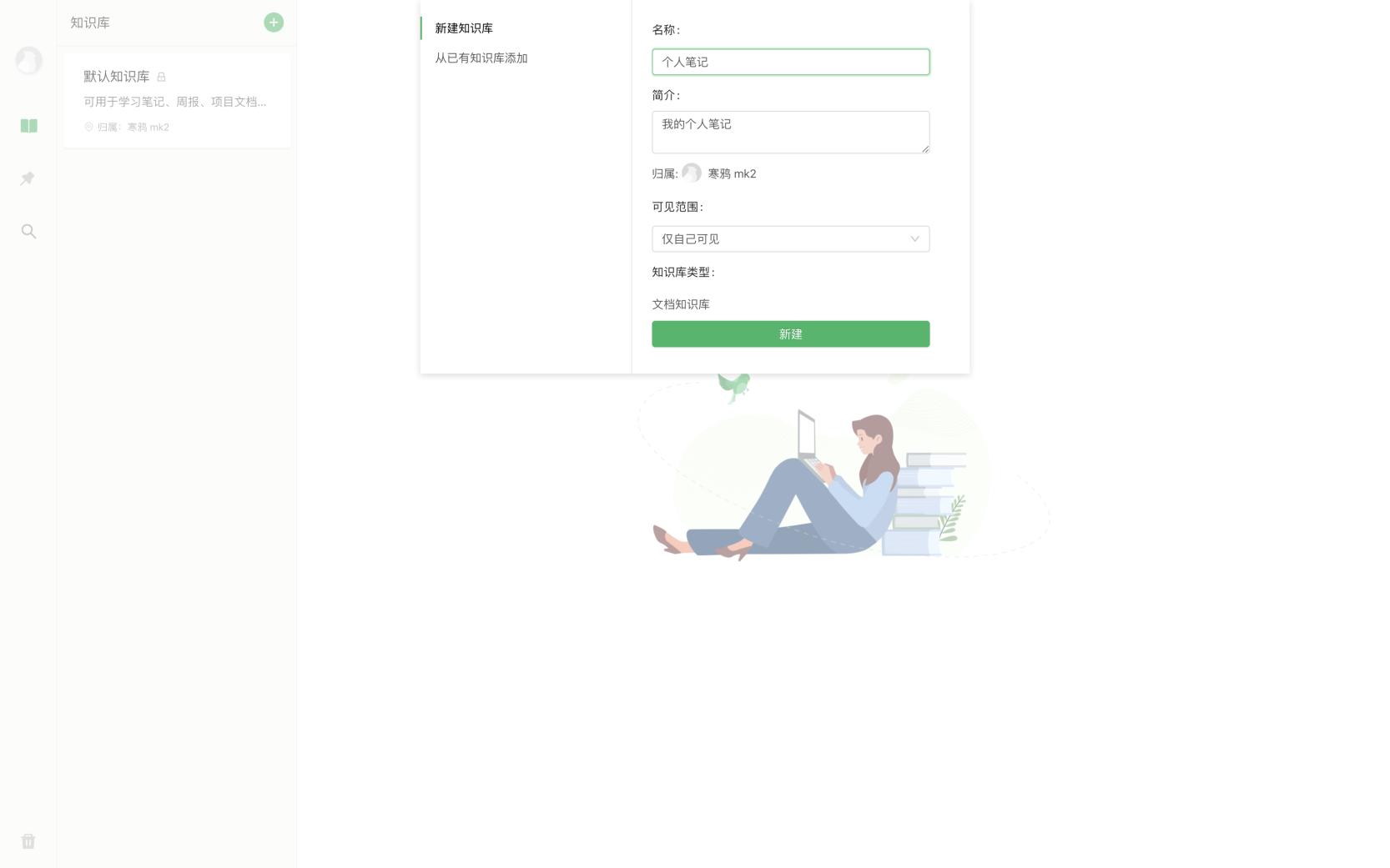 2、新建知识库(相当于一个笔记本儿),用于存放个人笔记,点击左上方