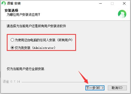 1、在本站下载语雀最新版软件包,解压缩后双击“Yuque-0.7.14.exe”程序开始安装,选择为哪位用户安装该应用,默认即可,点击【下一步】继续