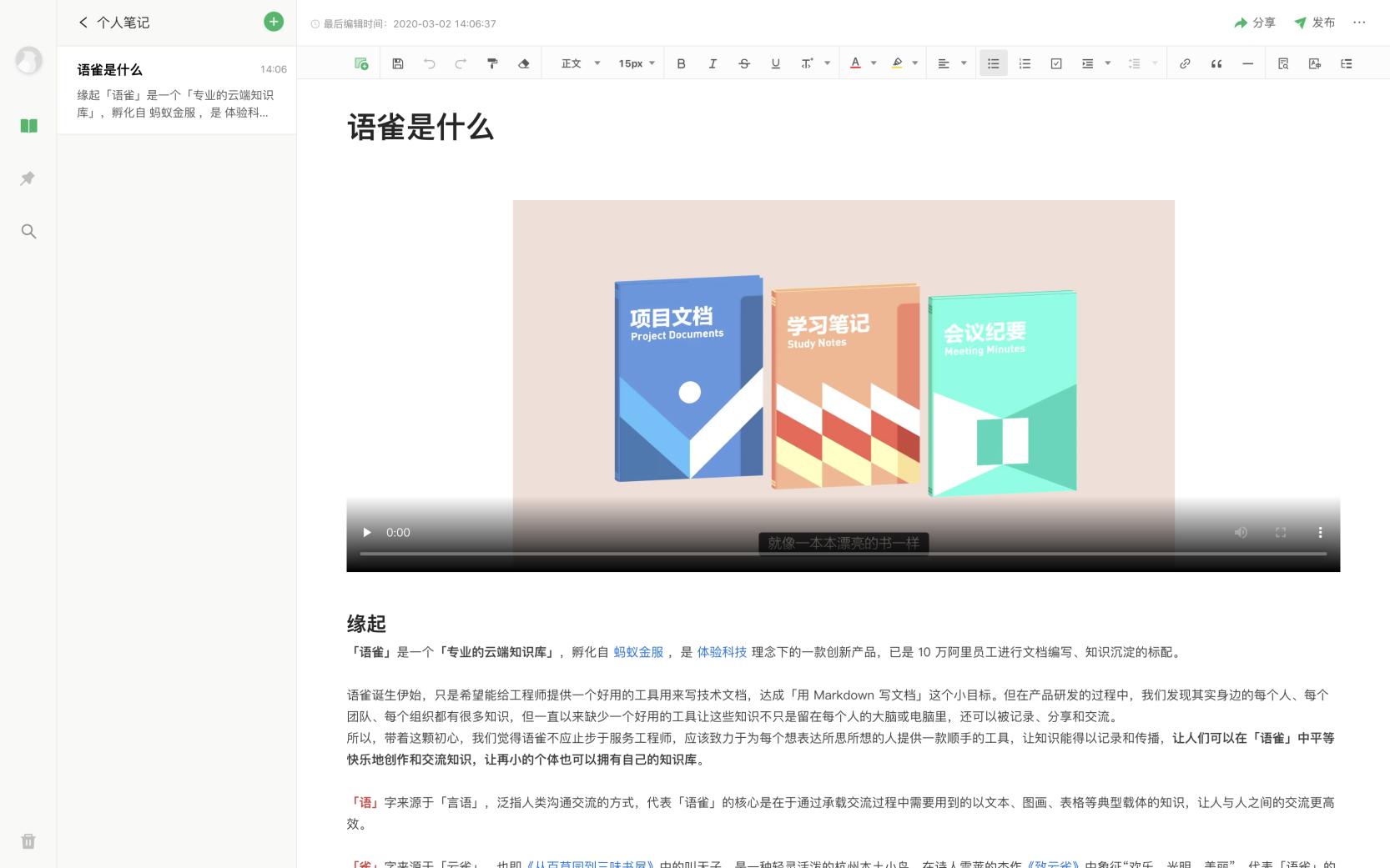 语雀最新版是一款云端知识库管理软件,语雀版为用户提供协作办公平台,个人和团队都可以使用,语雀软件还是知识创作工具,致力于为每个想表达所思所想的人提供一款顺手的工具,让知识能得以记录和传播,让人们可以在语雀中平等快乐地创作和交流知识。