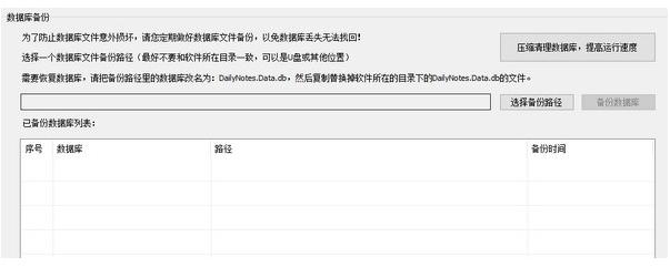 数据备份:软件所有数据和资料都保存在与软件同一目录下”DailyNotes.Data.db”数据库文件中,为了防止您数据损坏或丢失,