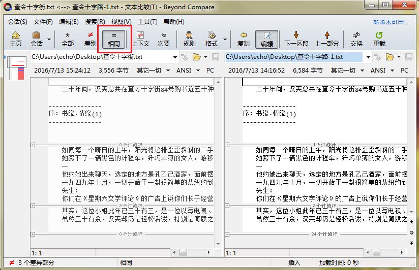 步骤二:在文本比较会话作界面中,单击“打开文件”按钮选择需要比较的文本文件,您可以单击工具栏显示“相同”按钮,软件将会自动过滤掉差异文本内容。