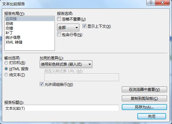 步骤三:弹出文本比较窗口,在报告布局栏目中选择文件布局比较方式,按照个人需求勾选报告选项内容,支持的输出方法包括:打印机、HTML报告和纯文本。