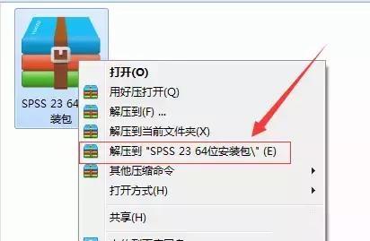 1.下载SPSS23中文版软件包,找到压缩包,右击选择解压到SPSS 23 位安装包。