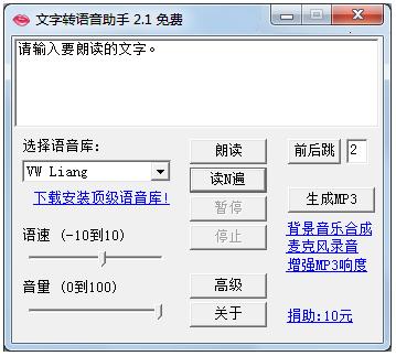 汇集顶级语音引擎,支持文字转MP3,可循环间隔朗读,可前后跳跃朗读。