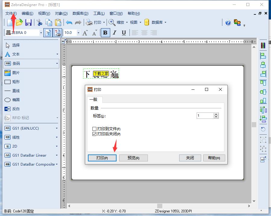 6、编辑完标签内容后,点击文件,打印,选择打印到文件点击打印按钮就OK了。
