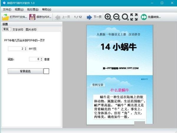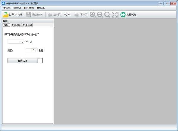 神奇PPT转PDF软件版是一款将PPT文件转换为PDF文件的软件。针对不同版本的PPT文件,本软件都可以实现转换。其转换后的PDF文件里的每一页图片,对应PPT文件中的每一个幻灯片,将完美呈现PPT文件的排版以及其他元素,用户无需担心转换后的文件排版问题。另外本软件可以将多页幻灯片合并为一页,还可以为每一页添加文字水印和图片水印。