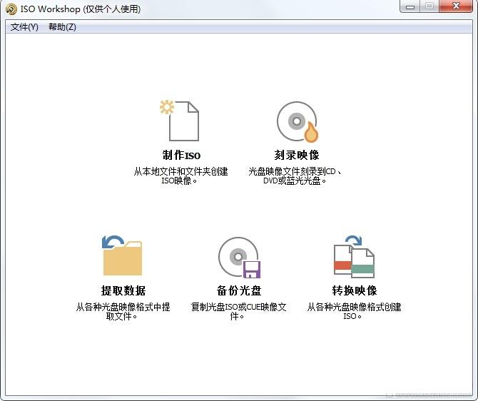 ISO Workshop中文版是一款非常不错的免费ISO镜像工具,支持ISP提取、备份、转换、刻录,包括CD、DVD、蓝光光盘。ISO Workshop中文版作简洁,主界面有四个大图标:从ISO提取文件、备份光盘镜像数据、转换ISO到其他镜像格式、刻录ISO到CD或DVD光盘。
