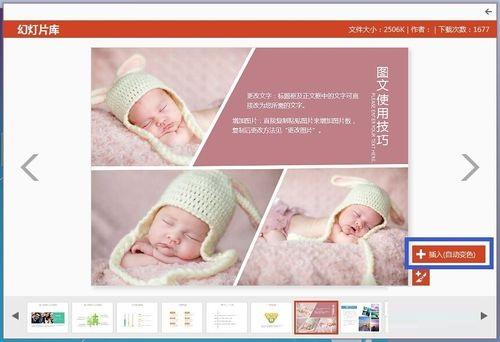 2.点击“幻灯片”选项,此时将打开“板式”选择界面,选择其中一款页面,点击右侧的“插入”按钮,即可应用到当前PPT文档中。