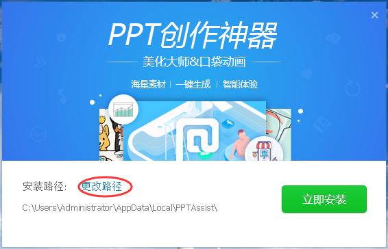 1、在本站下载ppt美化软件包,解压缩后双击“OfficeAssist.2.0.9.0489.80.12013.exe”程序开始安装,软件默认安装位置为“C:/Users/Administrator/AppData/Local/PPTAssist/”,点击“更改路径”可以选择其它位置安装
