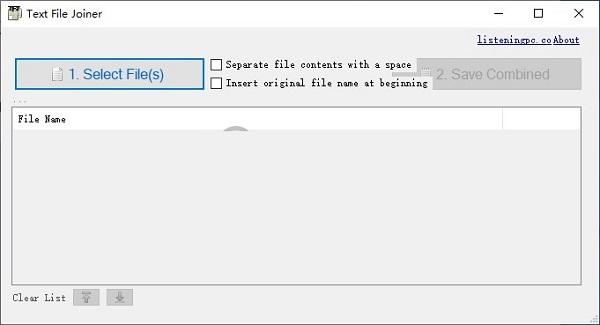 主窗口包含使您可以上载或合并文件以及更改项目顺序的按钮。将显示一个列表,其中包含您上载到程序的所有内容。还有两个附加选项,可让您用空格分隔文件内容,并在开头插入原始名称。