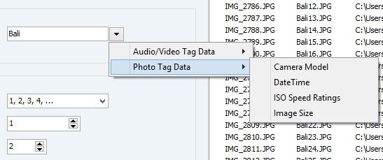 在文件名的某个位置添加文本和数字。可用时,元数据(拍摄期和时间、相机模式等。)可以自动插入到文件名中。可以使用三种插入模式:正常、覆盖、替换。