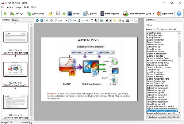 A-PDF To Video版使用许多淡入淡出效果使您的图片栩栩如生。它使用任何计算机都具有的2D硬件加速功能,包括旧型号的笔记本电脑。因此,创建的幻灯片不需要任何特殊的硬件,软件或任何文件即可运行。您的所有PDF页面和音乐文件都包含在的.EXE,.SCR或MPEG文件中。