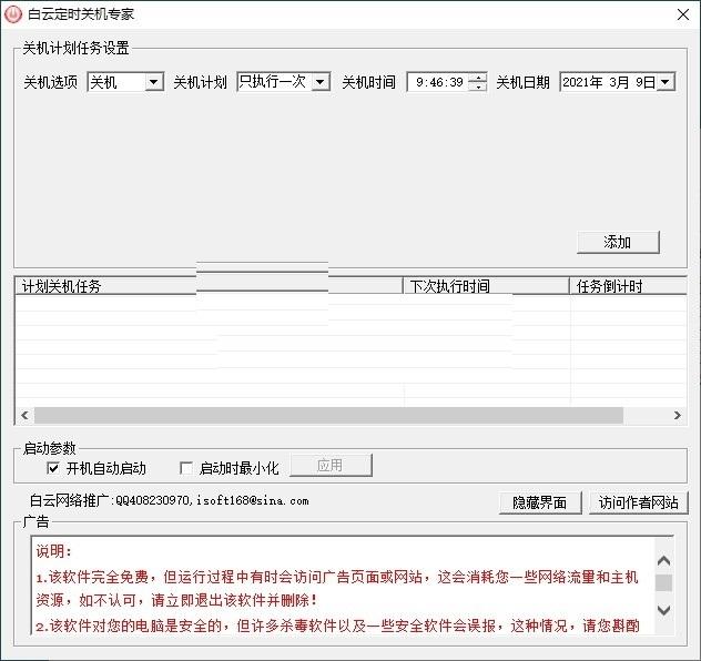 白云定时关机专家最新版是一款上手非常实用的定时关机工具,白云定时关机专家最新版软件可以帮助您通过简单的配置后,实现定时自动关机、自动重新启动或自动注销。白云定时关机专家具备了简单直观的作界面,进入配置窗口后,用户只需设置关机选项、关机计划、关机时间、关机期等基本参数,随后即可添加定时任务。