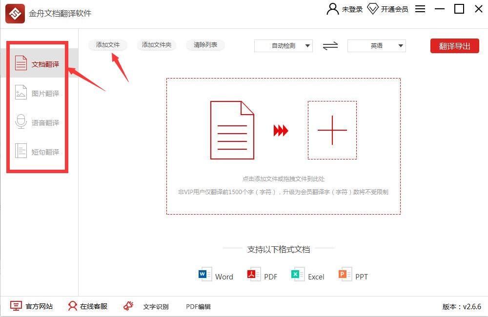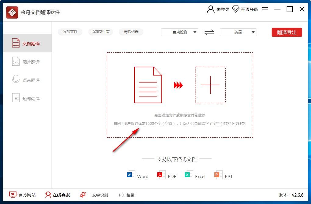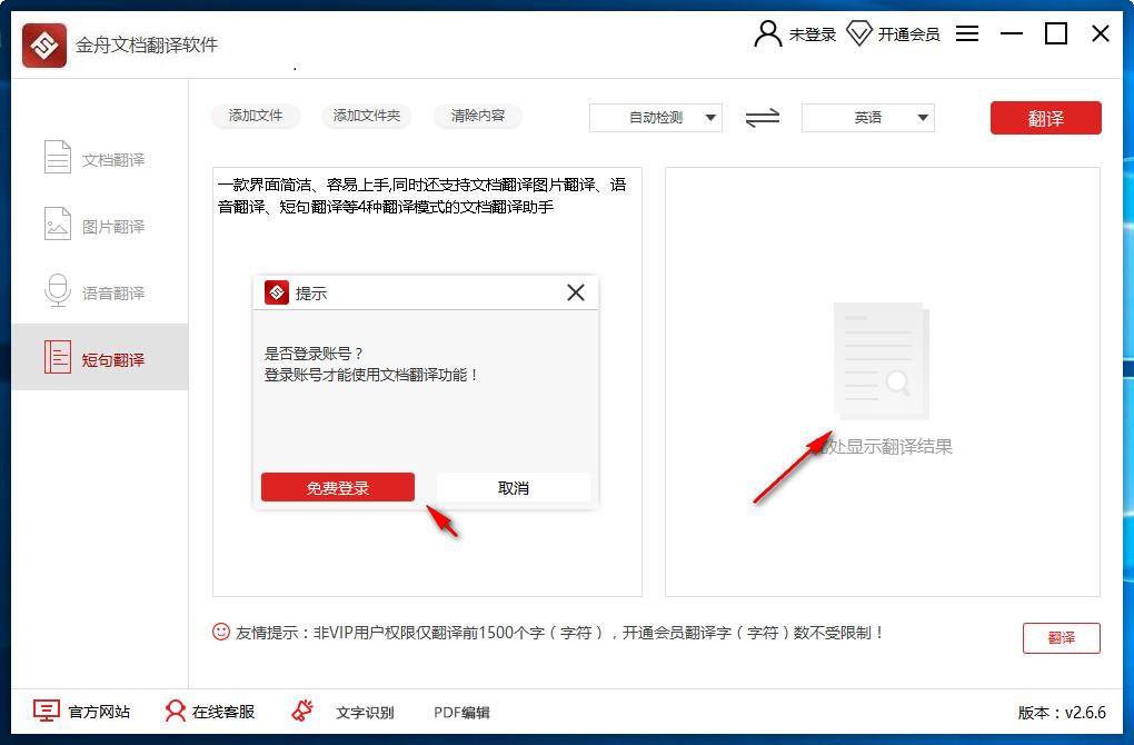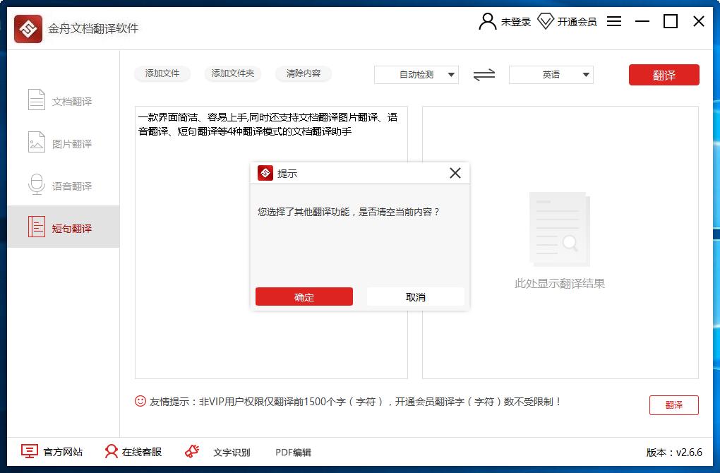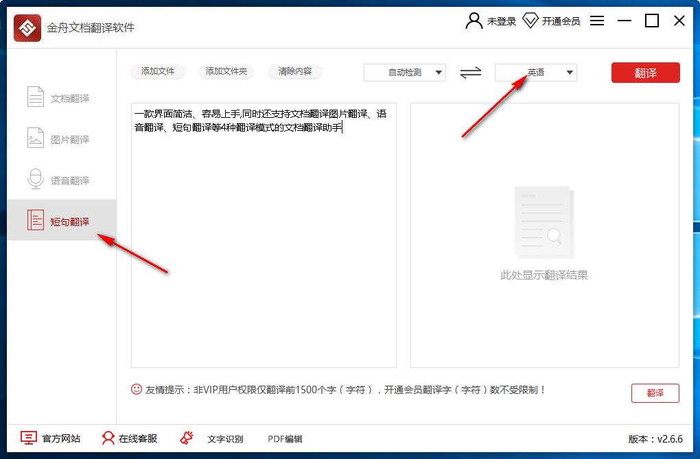 4、非VIP用户仅翻译前1500个字(字符),升级为会员翻译字(字符)数将不受限制