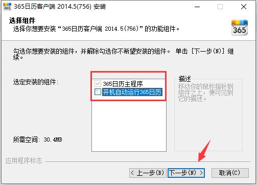 3、选择需要安装的组件,建议取消勾选开机自动运行365历,点击【下一步】继续