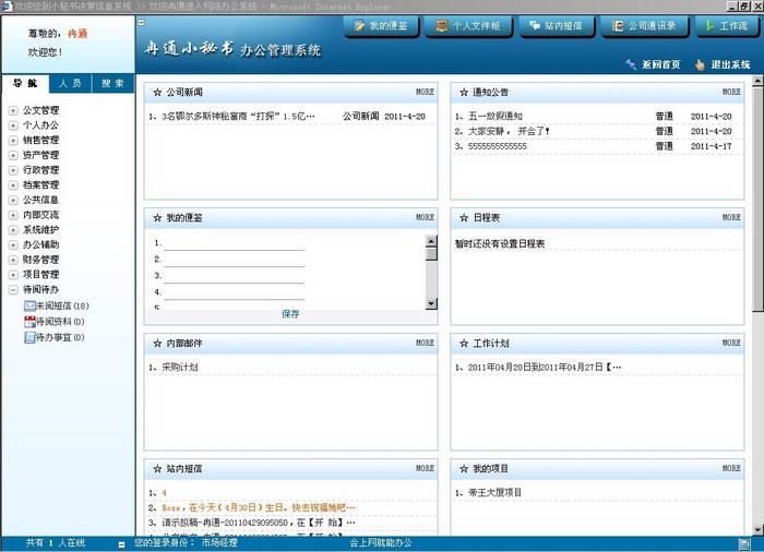 小秘书免费OA办公系统除具有一般OA的所有功能外,另外包括人事管理(HR)、客户关系管理(CRM)、项目管理、进销存管理, 即时通信软件 、邮件服务软件、财务管理等,实现了一套软件、多种应用。